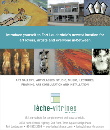 Owner Danielle Lanteigne, is hosting the official opening of Fort Lauderdale's newest art gallery, Lèche-Vitrines Art Alliance (3038 North Federal Highway). This mouthful of a name is no attempt at being ostentatious. "Lèche-Vitrines," Ms. Lanteigne explains, "is a phrase the French use to mean 'window shopping'." Although this translation is entirely less awkward than its direct meaning, 'to lick the windows', that may be just what you'll want to do when you enter this surprisingly chic, yet non-pretentious art gallery located in the Times Square Design Plaza on the Southeast side of Oakland Park Blvd and Federal Highway. With an entire wall of nearly floor to ceiling windows taking up two 2nd floor storefronts, the art that can be seen through these impressive veneers truly borders on delectable.